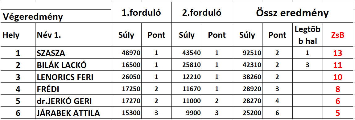 1, SZASZA 6 pont több mint 140 kg fogott súly. 2, FRÉDI 7 pont 80 kg össz súly és 3, dr. JERKOVICS GERI 7 pont 40 kg feletti össz súllyal !